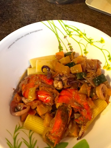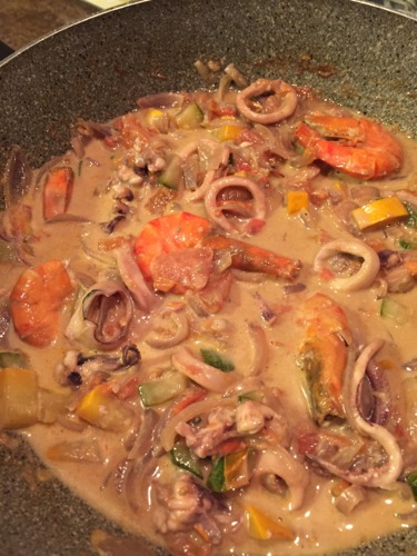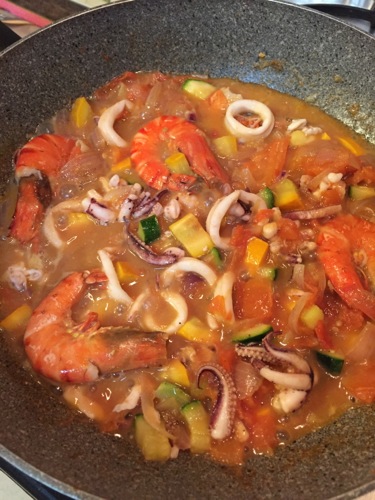 バター&オリーヴオイルで玉ねぎを炒めたあと、ズッキーニやイエローペッパー、トマトなどの野菜を炒め、あとからエビとイカを投入。