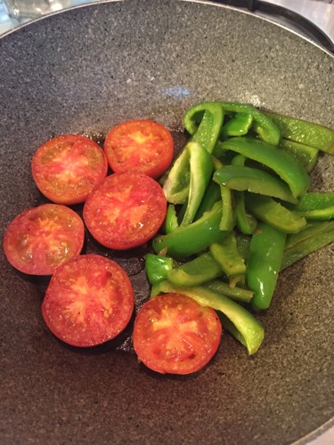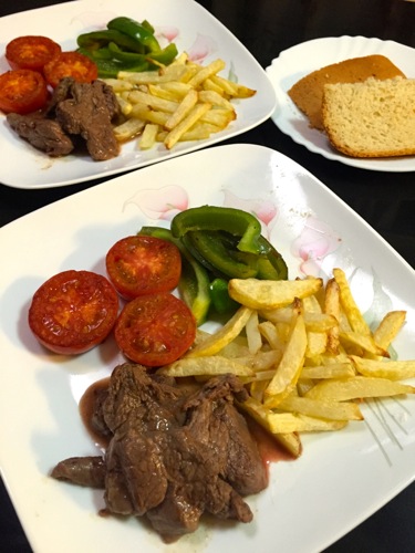 牛肉はスライスしてバター焼きに。付け合わせはエアフライヤーで加熱したフライドポテトとピーマン、トマト。