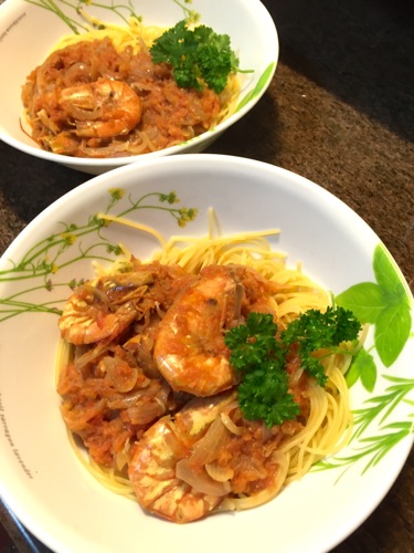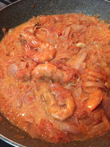 玉ねぎ炒めて、ブレンダーでジュースにしたトマトを加えて……と、途中までは北インド風カレーを作るときのプロセスに似ている。が、各種スパイスのかわりに、塩と胡椒、そして茅乃舎の野菜だし。バルサミコ酢を少々。これにエビやイカなど魚介類のだしが出るから、旨味が増す。