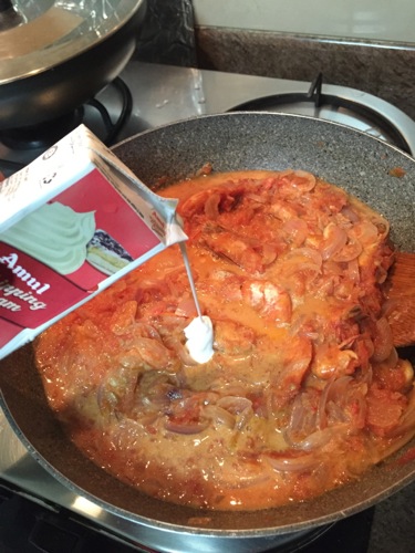 ただ、ちょっとリッチな味わいにしたいときには、生クリームを加える。前日、別の料理に使っていた、これはいつものビニル袋入り使い切り生クリームとは異なる、ロングライフのホイップクリーム。これを加えて濃厚に。風味が豊かにおいしくなります。カロリーは少々高くなるけれど、たまにはね。