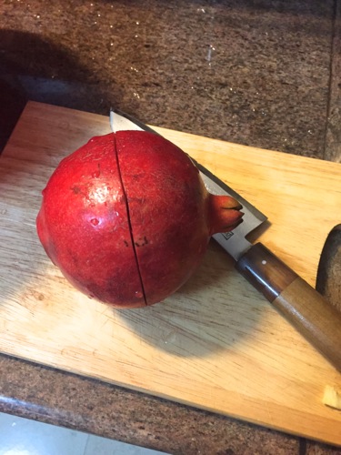 実はザクロが非常に剥きやすい方法にたどり着いたのだ。こうして、横向きに切れ目をいれるのがポイント。
