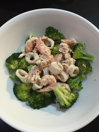蒸したたっぷりのブロッコリー。この上にシーフードのマリネを載せたシンプルサラダは、夫のお気に入りでもある。これはエビとイカを茹でたものを、マヨネーズとマスタードで和えたもの。軽く塩胡椒も。こちらに味をつけるので、ブロッコリーはそのまま。おいしい。
