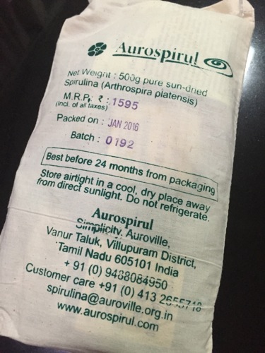 そしてこちらがスピルリナ。これは英語の家庭教師の先生、シブに勧められた。彼女はドラッグストアで手に入る錠剤を購入しているらしいが、わたしはオーロヴィルからオーガニックのパウダーを取り寄せた。たまに近所のオーガニックショップでも購入できるが、なにしろ在庫がない場合が多いので。オンラインで注文した方が確実なのだ。