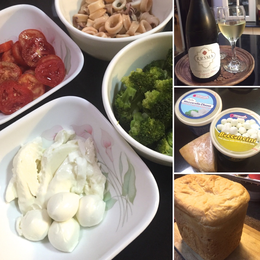 夜はチーズをメインにしたいがゆえ、「おつまみ」のような軽い取り合わせ。夫が焼きたてのパンと食べたいというので、帰宅時間に合わせてホームベーカリーをセット。