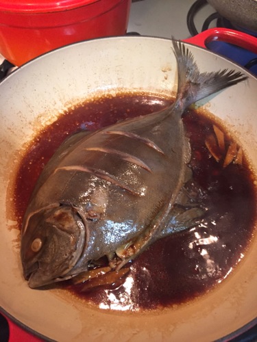 ちなみにブラック・ポムフレットの煮付け。一番上の写真はまだ、調理の途中。このあと、煮汁を上からかけながら、もう少し煮込んだのち、完成。たっぷりの白身に味がほどよくしみ込んで、非常においしかった。