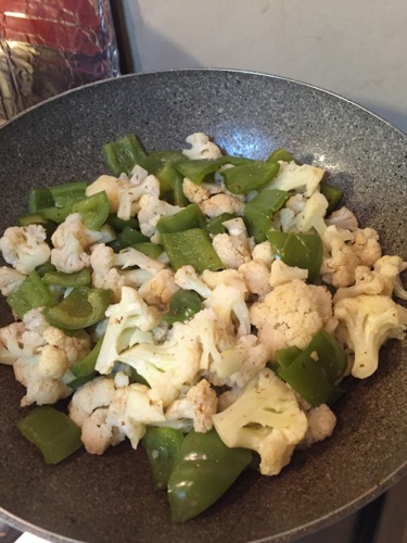 付け合わせは、カリフラワーとピーマンの炒め物。毎度、量が多いが、次の日のランチにまで持ち越すのでノープロブレム。