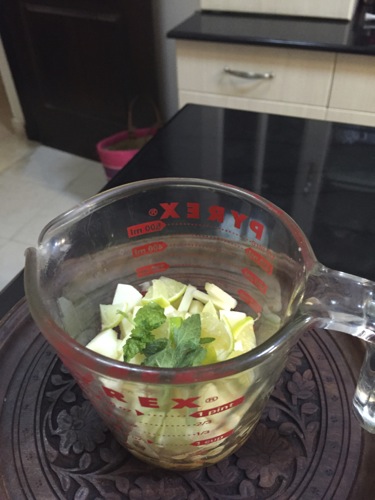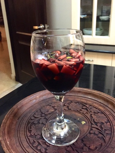 レモン、リンゴ、庭のミントなどを適当に切り、ハチミツで甘味をつけて、ワインを注ぐ。そして冷蔵庫で冷やす。