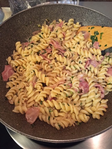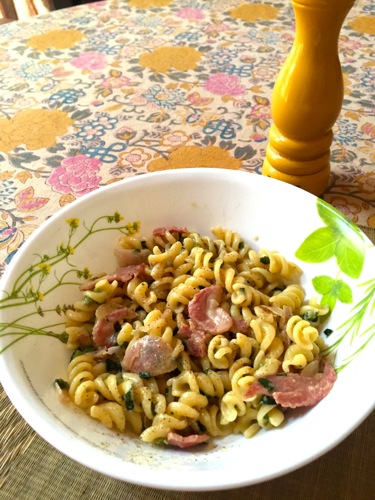 バターやガーリックを多めに入れて風味をつけ、茅乃舎の野菜だしでコクを出す。こういうパスタは、無闇に具を入れず、シンプルに、パスタに味をしみ込ませるのが好み。