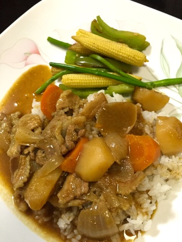 そうそう、日本のカレー風に、少しとろみが出るように、水に溶いた小麦粉も加えておいた。