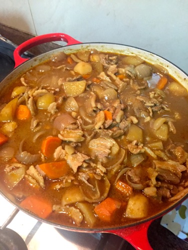 玉ねぎをバターで炒め、そこにジャガイモやニンジンを入れて炒める。この辺までは、多分日本のカレーと作り方は同じだろう。水を適量加え、まずはこれらを柔らかくなるまで煮込む。