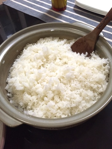 普段はルクルーゼの小さめの鍋でご飯を炊いているが、今回は人数が多いので、日本の鍋用の鍋、で炊いた。打ち合わせをしているうちに、うっかりご飯を炊いていることを忘れてしまい(携帯電話のタイマーをセットしていたのに、無意識のうちに切っていた!)、底の方が少し焦げてしまったが、お焦げが好き、という人がいたので、よかった。