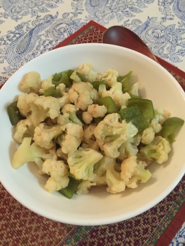 カリフラワー&ピーマンの蒸し焼き、茅乃舎の野菜だしで味付け。