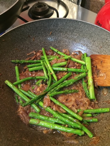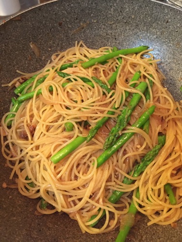 潰したガーリックと玉ねぎを、バター&玉ねぎのスライスとで、じっくりと炒めた。玉ねぎの甘みが出るまで、しっかりと炒める。本当はこれにパスタを混ぜるだけでも、おいしいのだと察せられるが、それだと野菜不足なので、アスパラガスを入れる。