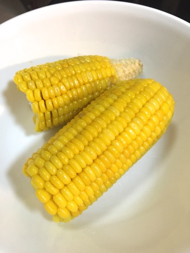 残りものの蒸しトウモロコシも出す。トウモロコシ。蒸すだけで、おいしい。