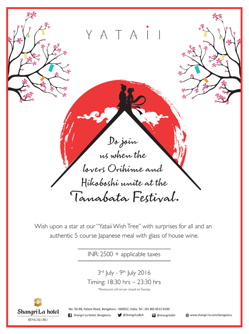 今年もまた、節目の年。海外生活20年。特に7月は夫と出会って20年&結婚15周年と、やたらメモリアルな感じだ。しかし、お互いにいろいろと用事はあるし、こまごまと祝すのもなんだな、と思っていた矢先、シャングリ・ラ・ホテルの日本料理店Yataiiから、七夕特別ディナーの案内が届いた。