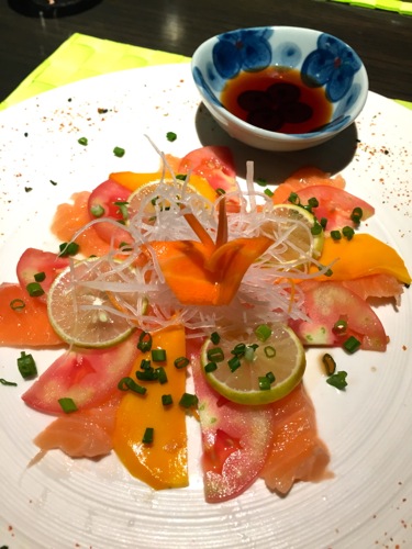 前菜。サーモンのカルパッチョ。マンゴーとトマトのスライスがアレンジされて、見た目も華やか。ニンジンで作られた「鶴」らしきものも、かわいい。