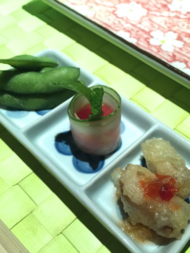 上品な盛りつけのアミューズ。枝豆、スイカ&キュウリ+ミントの葉、ナスのフライ……と、日常的な素材ながらも、かわいくおいしい。ヴェジタリアンの人もノープロブレムだ。