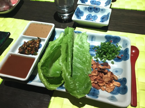 陶板焼きが届く前に、テーブルに供された脇役ら。和風だれ以外に、コリアンダーやチリほかマサラの風味が利いたトッピングもついていて、ユニーク。この日、インド人のお客さんがたくさん入っていたが、こういうアレンジが利いているところも魅力なのだと思う。香ばしいガーリックの風味やネギの風味は、日本人だけでなく、インド人にも好まれると思う。