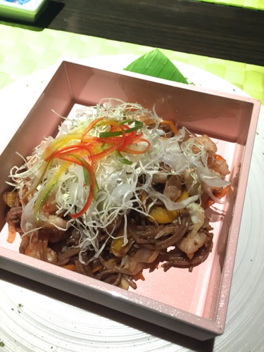 こちらは海鮮焼きそば。そばは、焼きそば用ではなく、「そば」が使われていることから、個人的には「ざるそば」が食べたいところだったが、ざるそばは、多分インド人には物足りない味覚世界だと思う。日本食が大好きな我が夫も、ざるそばは、敢えて頼まないことが多いので。