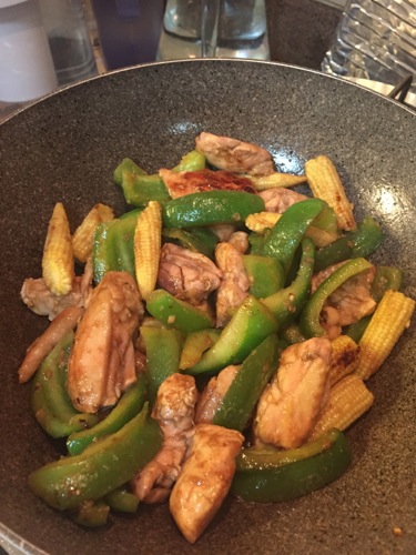 ピーマンとベビーコーンと鶏肉をまとめて炒める。一人の一食には見るからに多過ぎ。残りは翌朝のランチに。