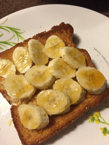 これもごはんじゃないだろう。これは朝食だ。ホームベーカリーで作ったパン。それにオーガニックの風味マイルドなバターを塗り、オーガニックのバナナのスライスを載せ、オーガニックのハチミツをかける。しつこいほどに、オーガニック。シンプルながら、これまた幸せな朝の一皿。
