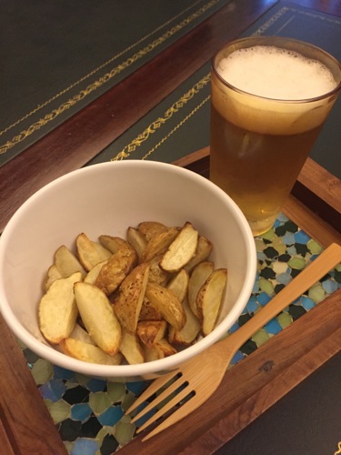 と、自分に突っ込みを入れつつのおつまみ写真。エアフライヤーは実にいい。オーガニックのジャガイモを適当に切り、水にさらしたあとザルに上げ、完全に水気を拭き取ったあとに軽くオリーヴオイルをまぶしてマシンに投入。15分程度で、ほくほくとしたフライドポテトができあがる。