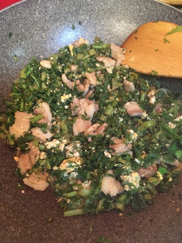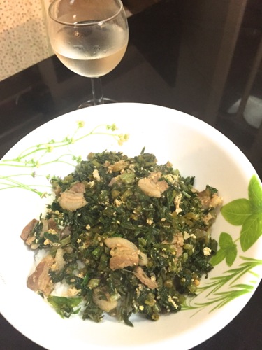 オーガニックの大根を買った時には、葉っぱも大切に。和風で味付け、豚バラと炒める。炊きたてご飯にかけて、どんぶりにして、日本酒とともにいただきます。