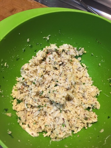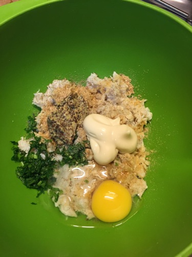 卵、庭のセロリの葉のみじん切り、塩胡椒、マヨネーズ、マスタード、そしてパン粉を加える。