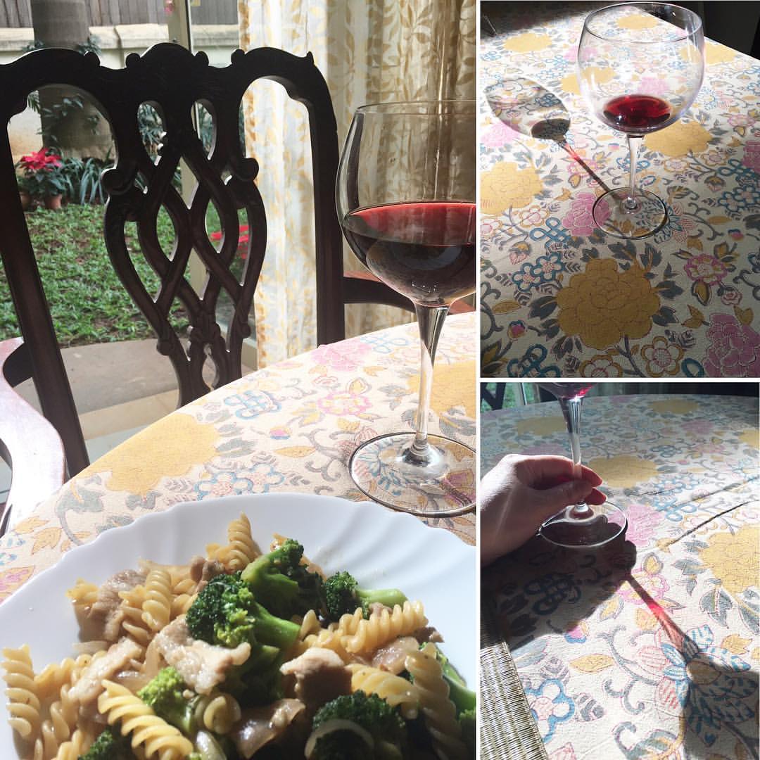 My husband is out of town. I am enjoying the Friday night alone. Actually with 3 cats. Simple dinner and my favorite wine. Lovely.