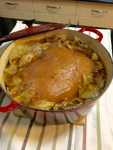 日本では販売されていない巨大サイズのルクルーゼ鍋に、たっぷりのキャベツを敷き、肉をのせ、隙間にまたキャベツ。3〜4時間ほど煮込む。