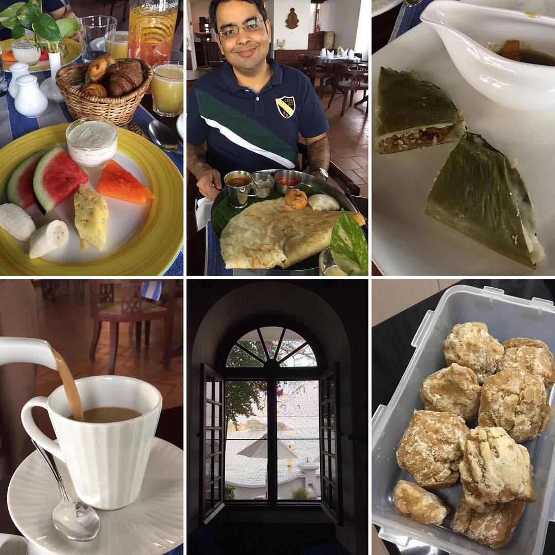 夫はマサラドサにイディリ、ワダのセット。わたしはジャガリとココナッツの具が入った蒸した餅のようなものを。