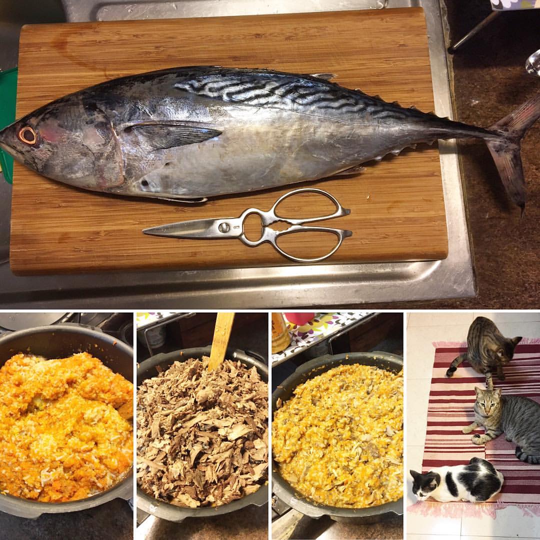 1日2食は手料理、1食は良質のキャットフード。最近の彼らのお気に入りは、ツナ。Freshtohome.comで最も廉価なこの魚を2キロ分、一気に調理。適当に切って、少なめの水で蒸し煮て、身をほぐす。