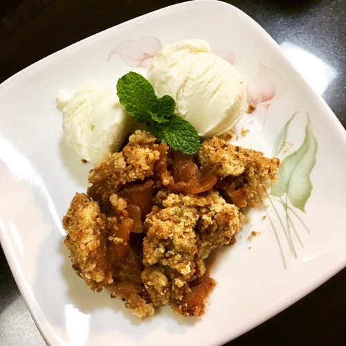 英国のホームメイド的レシピにて。素材は、りんご、ジャガリ(無精製の天然の糖)、小麦粉、バター、シナモンパウダー。ともかく簡単! まだ温かいアップル・クランブルに、お気に入りのアイスクリームのミルク味を添えて出す。とてもおいしかった!
