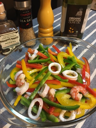 カラフル・ピーマンのサラダはパパのお気に入りなので、今回もあっさりと。エビとイカをボイルしたものを添える。