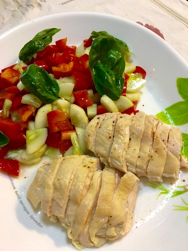 茅乃舎の野菜だしを多めに入れて、やや濃いスープを作る。塩胡椒も加える。沸騰させたら、そこに、丸鶏から切り取った胸肉の部分を2枚、ポトンポトンと入れる。再び煮立たせて火を切り、蓋をして10分あまり。