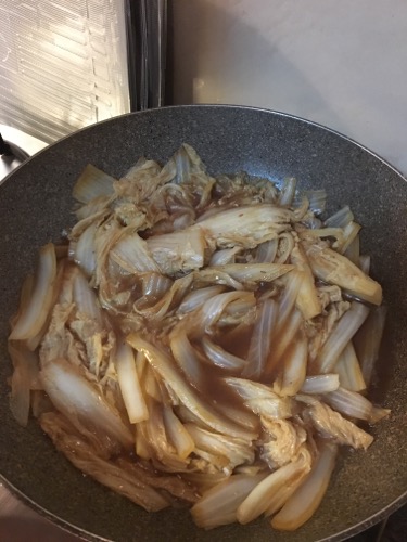 大雑把な白菜の煮付け。茅乃舎の和風だし&醤油などで味付け。パパも喜んで食べていた。普段は食べない野菜、しかも日本風の味付けだが、ノープロブレム。