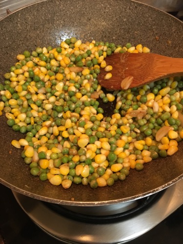 フライパンにバターを入れ、ガーリックのスライスを軽く炒めた後、茹でたグリーンピーと、トウモロコシを加えて炒める。じっくりと、炒める。塩胡椒をして、炒める。シンプルだけれど、噛み応えあり、嚙みしめるほどに、本当に、おいしいのだ。