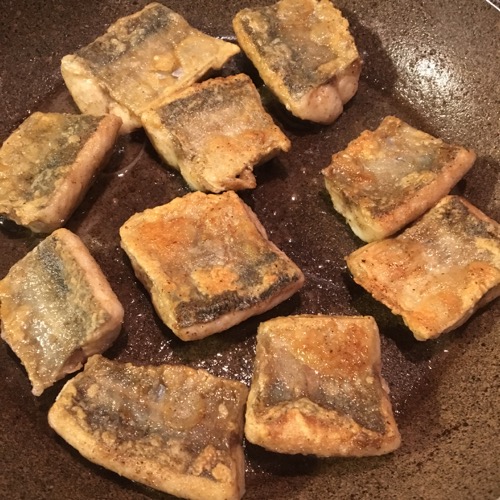 これは、ブラックポムフレットの煮付け。骨が多い魚は食べにくくて苦手なパパだが、この程度なら大丈夫。