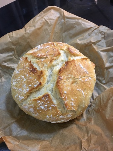 さて写真は、先ほど焼いた「捏ねない」パン。2度目の今回は、焼き時間などを少々変えてみたところ、皮はパリッと香ばしく、中はしっとり柔らかく、好みの味わいに仕上がった。素材はMAIDA(精製小麦粉)、シーソルト、イースト、ぬるま湯。今度はMAIDAのかわりにATTA(全粒小麦粉)でヘルシーパンを焼いてみよう。