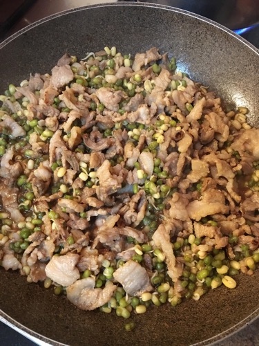 発芽豆は冷蔵庫で保存すれば数日持つ。最初のうちはサラダに入れたり。2日目以降は炒め物に使ったりしている。