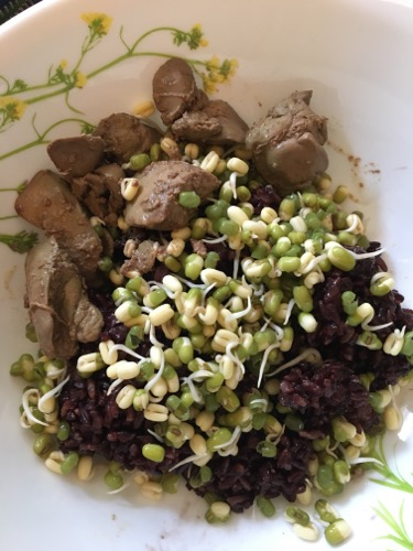 これは、残り物の冷や飯ランチ。鶏レヴァー、ブラックライスにスプラウト。冷たくてもサラダっぽくておいしい。何より、手間がかからない。