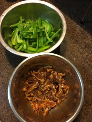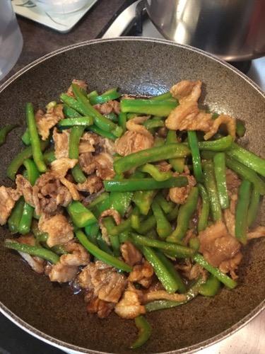 金曜日に買っていたオーガニックのピーマンの残り、ややしなびてはいるが、千切りに。豚肉とともに、炒める。