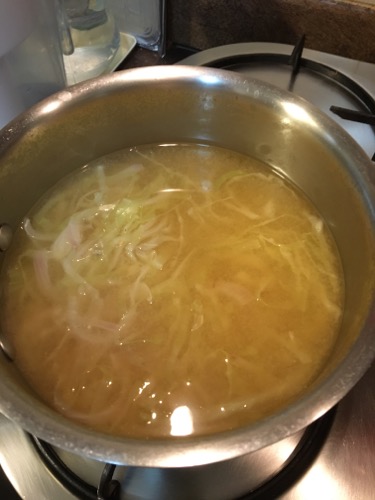 そして鍋に水をはり、茅乃舎のだしを入れて火にかけ、玉ねぎと、キャベツの残りを千切りにして加える。