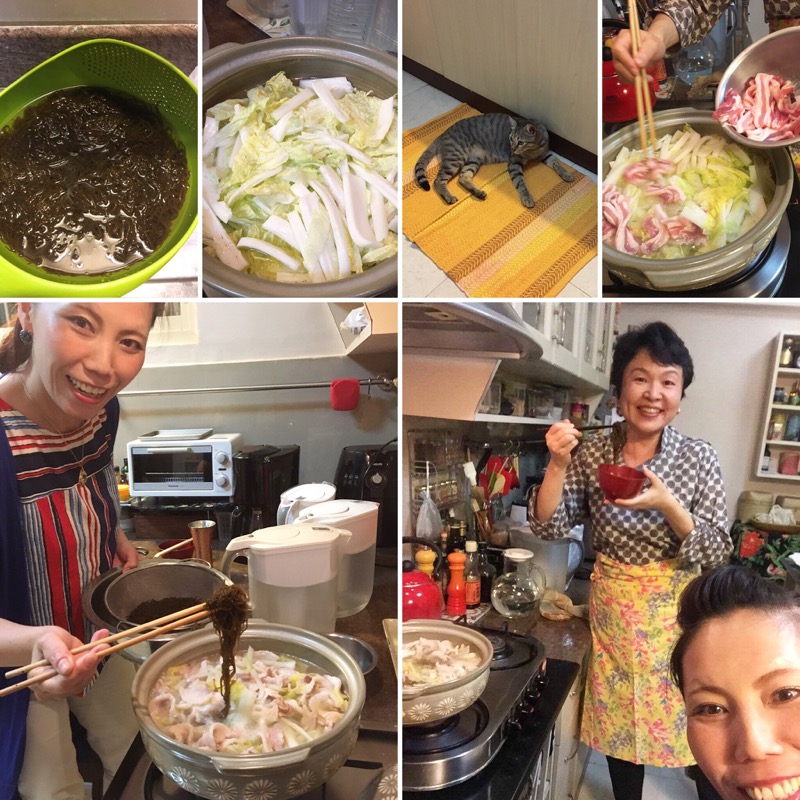 ハルヨさんのお土産もずくで、「もずく鍋」の夜。夫は出張中につき、二人で台所に椅子を運び込み、ビールを飲みつつ雑なディナー。カセットコンロがないもので、台所にて、しゃぶしゃぶ風に、もずくをしゃぶしゃぶしつつ。材料は、白菜、豚バラ肉、もずく、以上。ハルヨさんお手製のポン酢で味わう。
