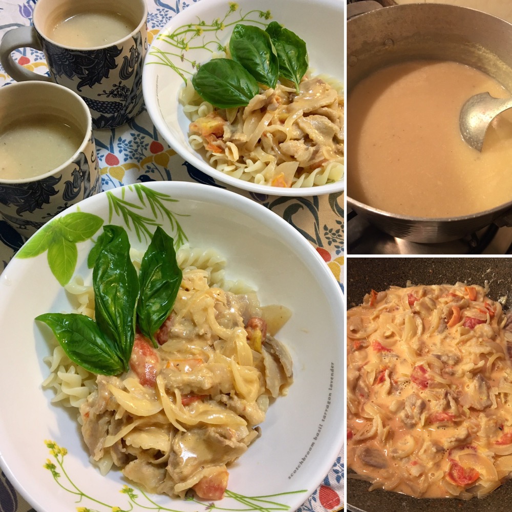 お菓子を焼くつもりで買っていた生クリーム。使うタイミングを逸したので、夕飯に。