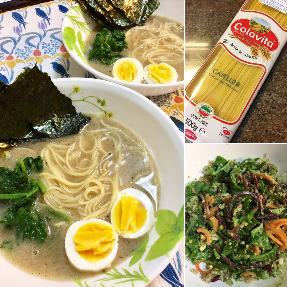 課題だった麺。研究会では細い「そうめん」がよかったが、今回、あらかじめ買っておいた細麺パスタのカペリーニを使ってみた。重曹を加えると中華麺っぽくなるとのことだったが、あいにく切らしており、そのまま茹でる。これがかなり、とんこつスープと合う。そうめんよりも、むしろいい。夫も喜んで食べていた。おいしかった。