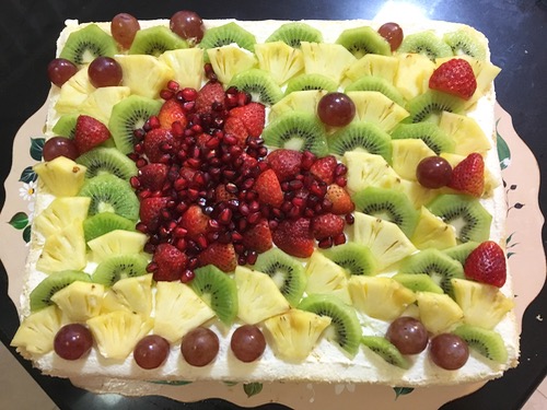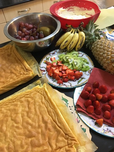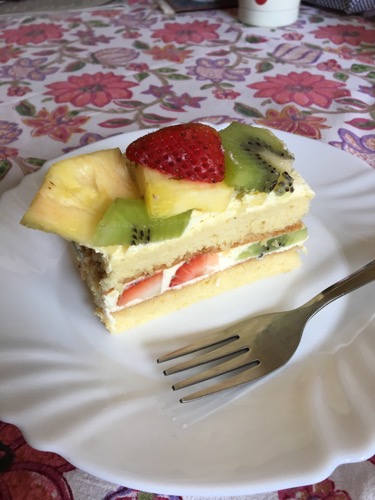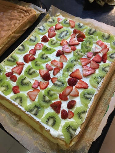 ともあれ、わたしは朝、スポンジケーキを2台焼き、それを重ねて巨大なフルーツケーキを作った。イチゴとザクロで❤︎模様。朝組メンバーには右側の余白を切り分けてお出しする。