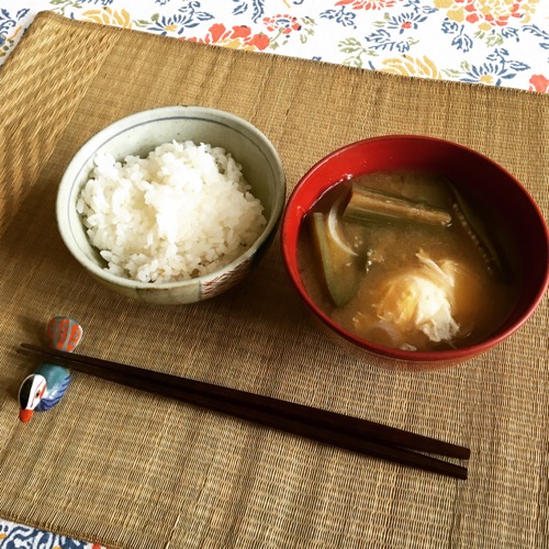 休日の朝、ごはんを炊き、ナスと玉ねぎで、味噌汁を作る。卵をひとつ浮かべれば、たちまち華やぐ。