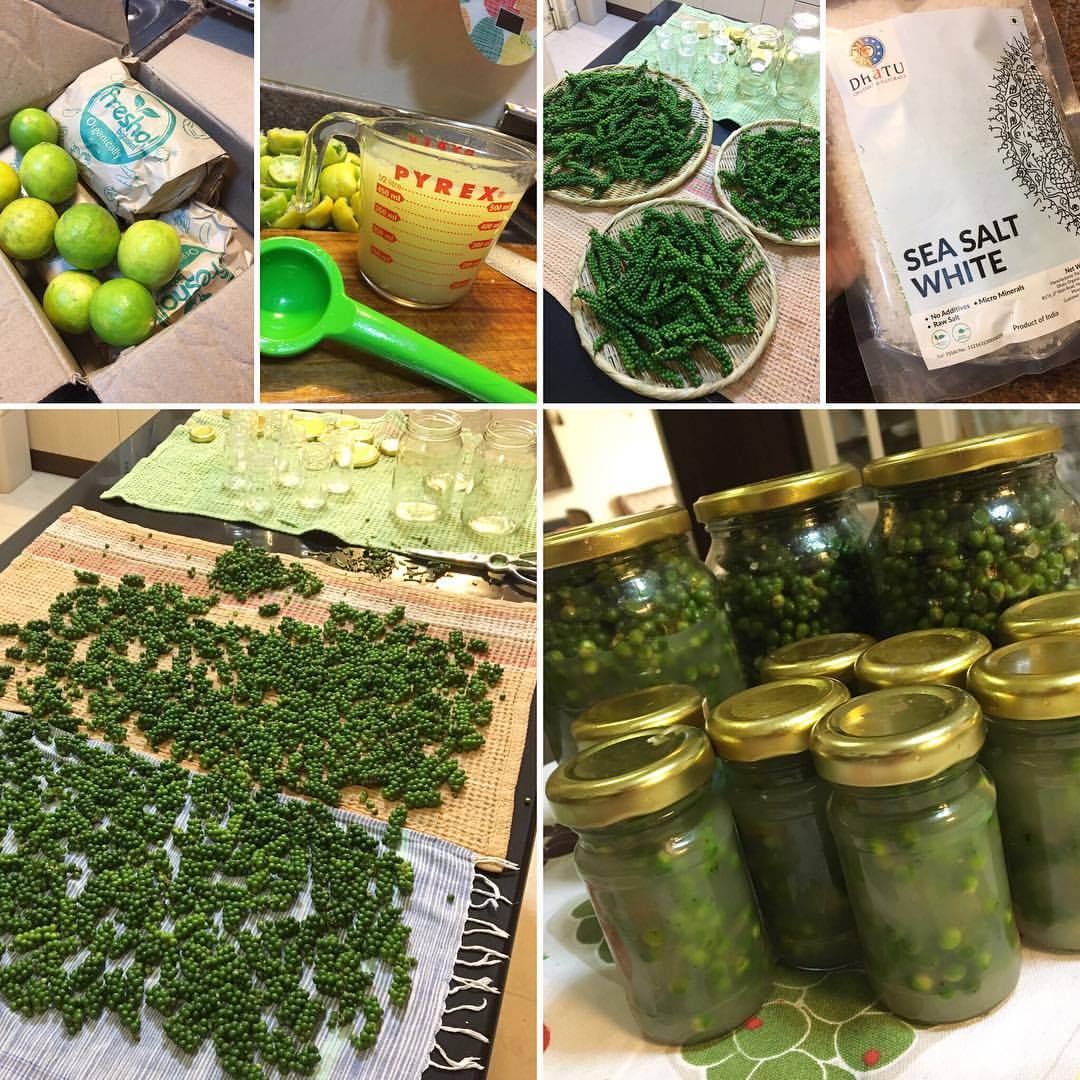 胡椒の実を洗って乾かし、7割をシーソルトを加えたレモン汁に漬け込む。レモンが足りなかったので、明日また追加。和洋中印、さまざまな料理の調味料に活躍する。実が青いうちは新鮮で辛味が強い。熟して赤い実が出てくるころは、マイルドになるという。