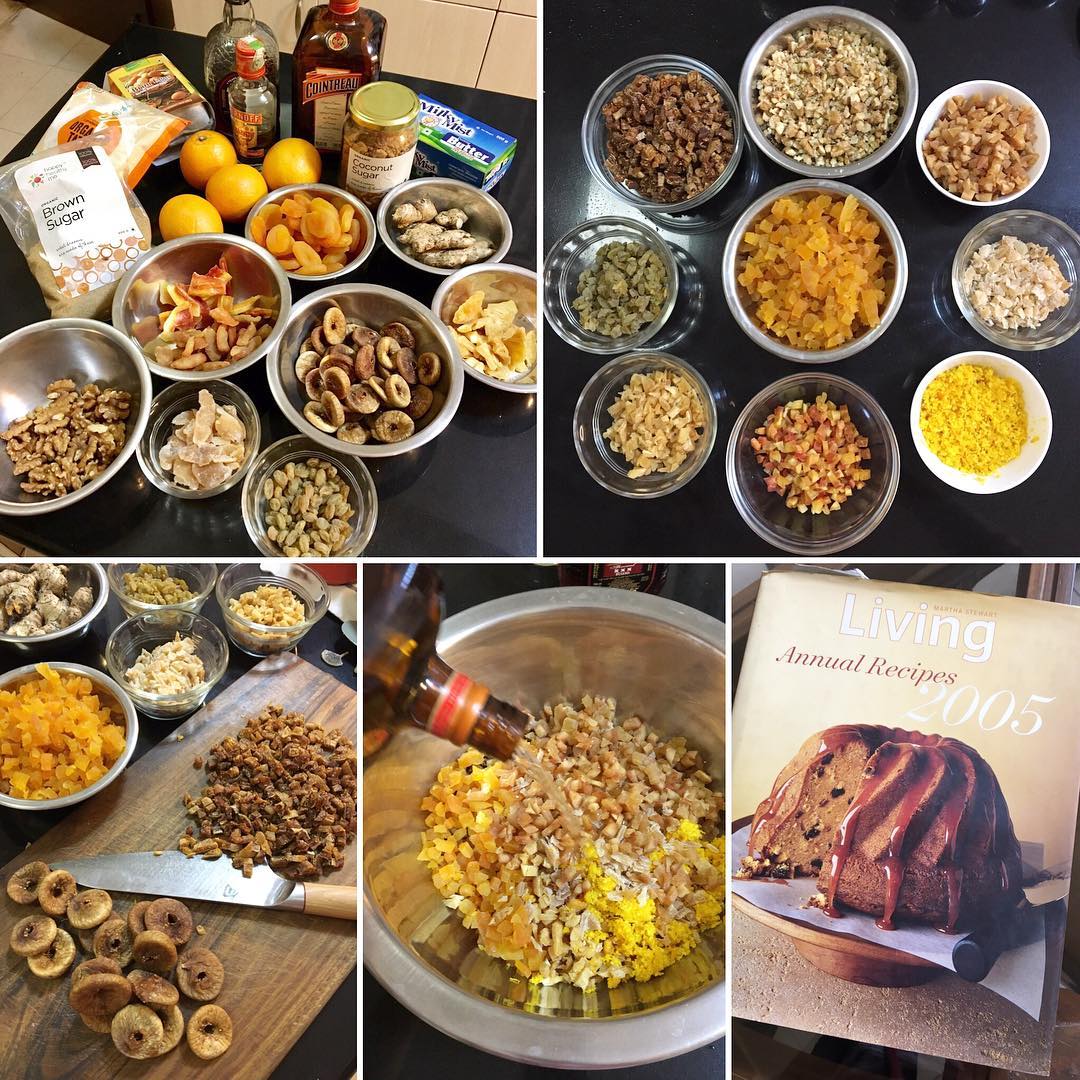 レシピは米国在住時に買っていたマーサ・スチュワートのクッキングブック。そもそもフルーツケーキが好きではなかったわたしが、5年前にこのレシピを参考にして作ったものが、とてもおいしかったので、今年もまた、それに従った。無論、材料を完璧に合わせられないので、レシピは適当にアレンジしている。